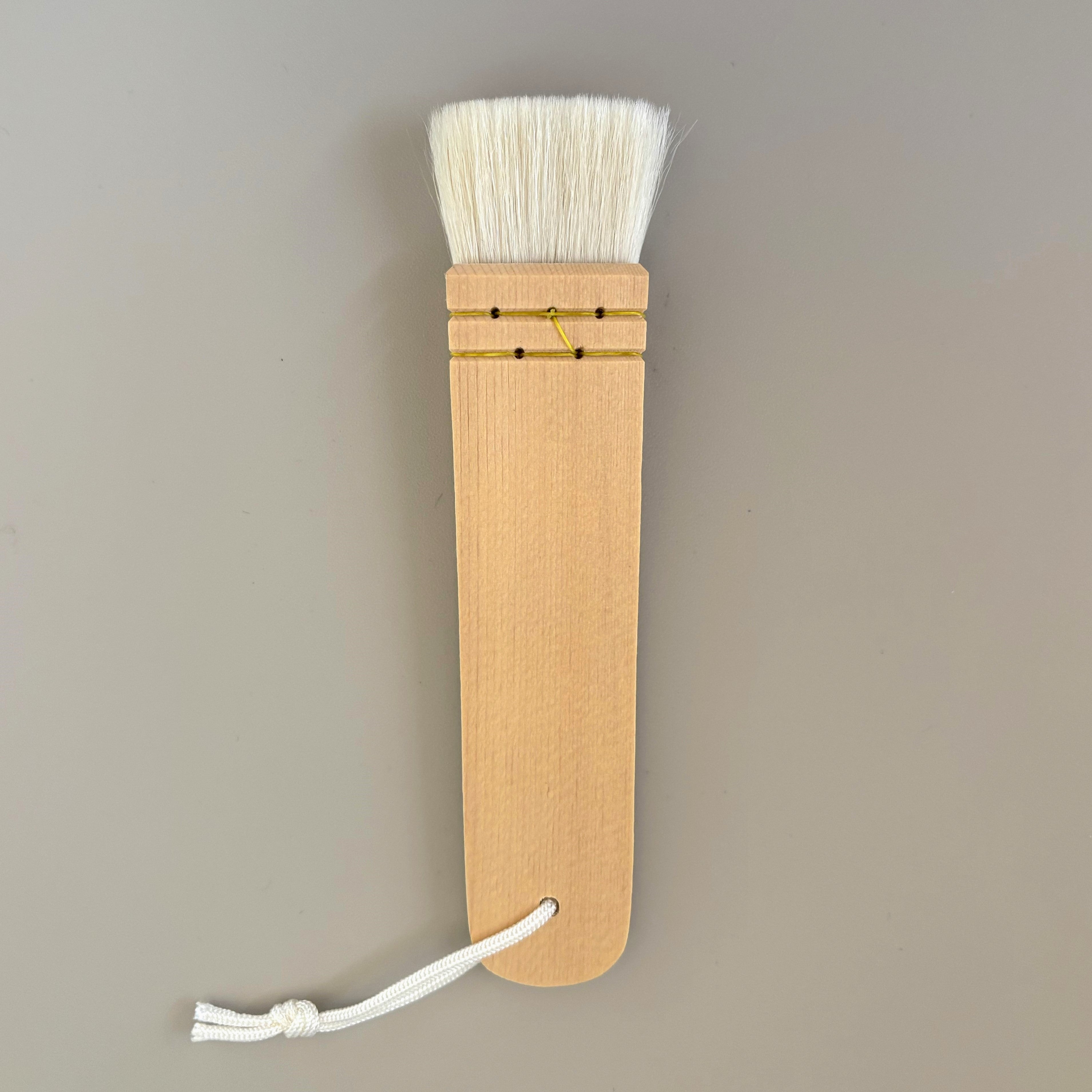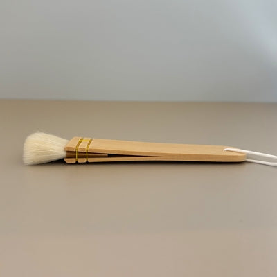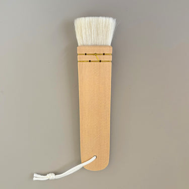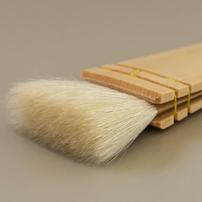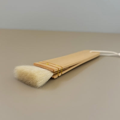 This handcrafted board brush is traditionally used in Japanese water-based makeup applications, such as those seen in Kabuki theater and classical dance. Made from thicker goat hair with moderate tip density and reduced oil content, it offers excellent water absorption and powder pickup. The flat, paddle-like shape allows for smooth spreading and blending of white powder over the skin. Recently, it has also found a place in modern beauty routines for applying liquid foundation, especially on broader areas like the back.
