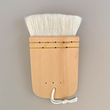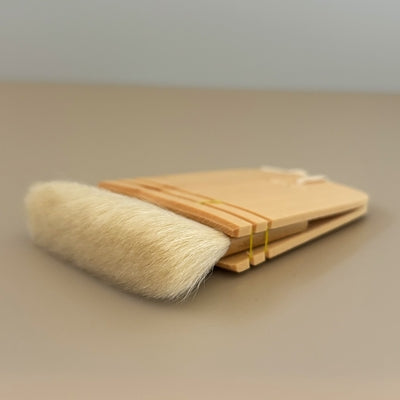 This traditional Japanese Board Brush (Size 2) is designed for professional use in classical water-based makeup applications, such as those seen in Kabuki and Japanese dance. Made from 100% goat hair, the brush features moderately dense bristles that are thicker and oil-removed for enhanced moisture absorption. Ideal for spreading foundation-like white makeup, blending powder, or smoothing the skin’s surface, this flat brush also serves modern purposes—such as applying liquid foundation to larger areas like the back.