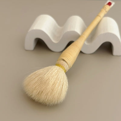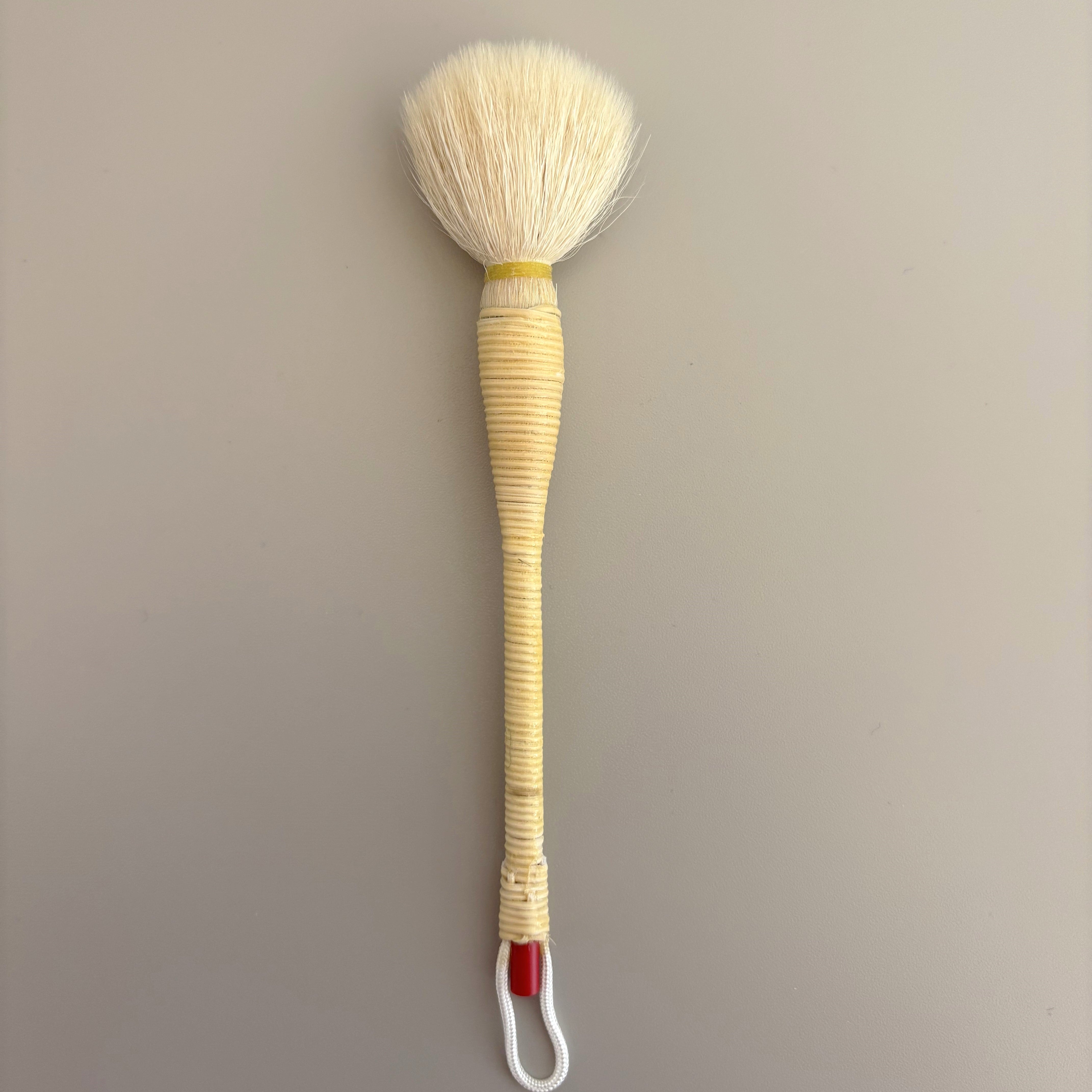 A traditionally handcrafted Yachiyo brush, the 7-bu size offers a balanced shape ideal for applying blush, highlighter, and eye makeup with precision and softness. Designed with performance and heritage in mind, the goat hair bristles are treated to enhance water absorption, reduce oil, and moderate density at the tip, making it especially effective with the water-based powders used in Kabuki and classical Japanese dance. Its handle is wrapped in rattan by hand using time-honored techniques, offering both grip and authenticity—a refined tool for traditional and artistic makeup styles.